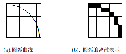 和直线算法类似,Bresenham 画圆算法也是用一系列离散的点来近似描述一个圆,如下图。