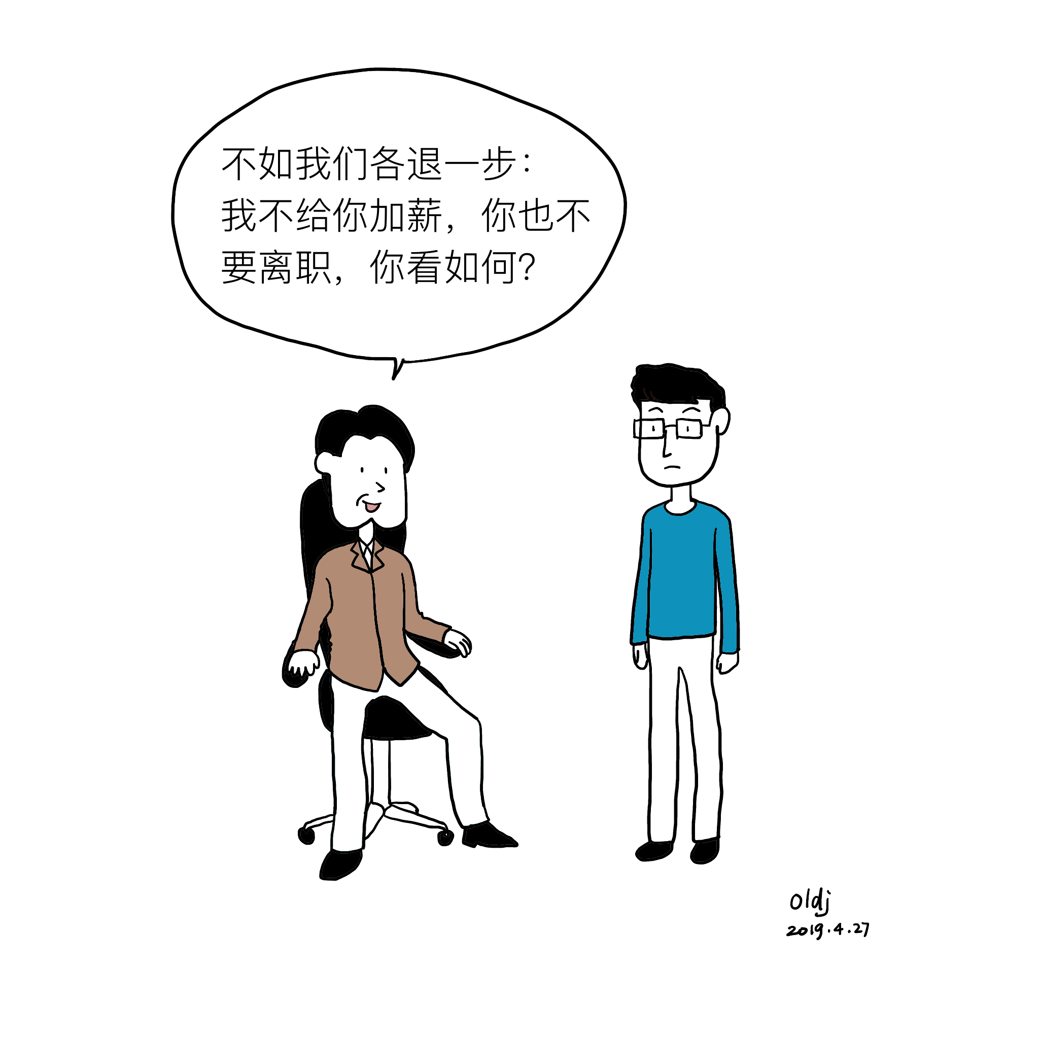 以前在知乎上看到一个段子,大意是员工向老板要求加薪,说不加薪就离职,老板回复说不如我们各退一步,我不给你加薪,你也不要离职,如何?总觉得挺搞笑的。尝试根据这个段子画了一幅漫画,如下: