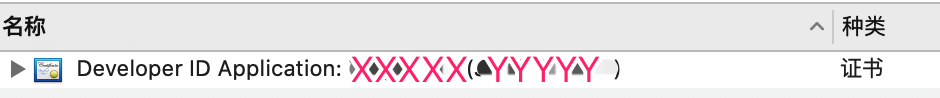 其中 YOUR_IDENTITY 为你的证书的标识。比如你在 KeyChain 中看到你的证书名称类似“Developer ID Application: XXXXX (YYYYY)”,如下图: