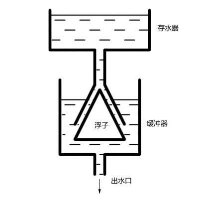 克特西比乌斯的方案的示意图见上图。我们可以看到,他在存水器与最终的出水口之间加了一个缓冲器,存水器由一根尾部为倒漏斗形的管子与这个缓冲器相连,倒漏斗形与缓冲器中间,有一个圆锥形的浮子。如果缓冲器中的水位过高,浮子会升起,堵住倒漏斗,从而阻止存水器中的水继续进入缓冲器,如果缓冲器中的水位过低,浮子会离开倒漏斗,让存水器为缓冲器加水。这样,就能让缓冲器中的水位保持恒定,从而也保证了出水口水流速度的恒定。