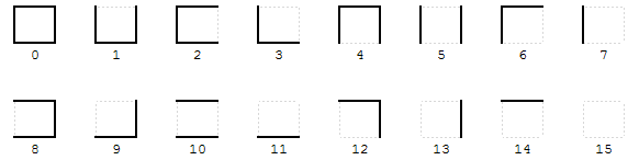 注意,上面的编号并不是随意的。由于每个格子有四条边,每个边有两种状态(可通过与不可通过),如果我们用 0 表示某一条边不可通过,1 表示可通过,这样,四条边的状态就能组成一个四位的二进制数。我们把四条边按从上方开始按顺时针方向的上、右、下、左四个方向的状态分别代表二进制数的个、十、百、千位的话,得到的二进制数的十进制值就作为这个格子的编号。如下图所示。
