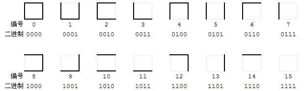 这一个迷宫是基于平面上的方格的,每一个格子有上、下、左、右四个方向,每个方向上可能有墙(不能通过),也可能没墙(可以通过)。这样,每个格子实际上就有 16 种可能的状态,我们用 0 ~ 15 来给每一种状态编一个号。如下图所示。