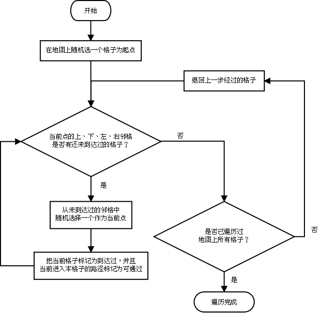 确定了地图的表示方法,接下来的问题就是怎么生成地图。在这个游戏中,生成地图的方法比较简单:从某个格子开始,随机地遍历周边的未到达过的格子,如周边没有没到达过的格子了则后退一步,如地图上所有点都已到达则遍历完成,地图也就生成了。见下面的流程图。