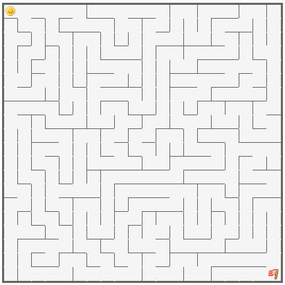 另外,这个算法生成的迷宫属于单连通迷宫,这类迷宫都有一个通用的简单解法“扶墙法”,即从起点开始,伸出一只手(左手右手都可以,看个人喜好)扶住墙壁,接下来就一直沿着这一边的墙走,无论转弯还是直走,都要保证这只手不要离开墙,这样虽然走的路线很可能不是最短的,但是能保证让你到达终点。