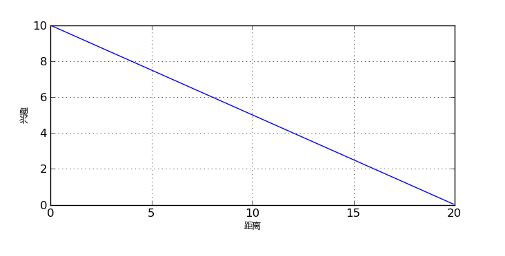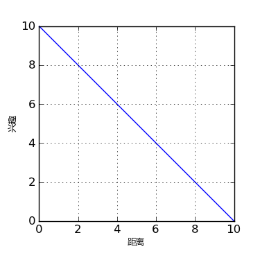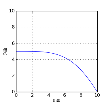 上面的热区图已经基本可以使用了,不过,我们应该清楚,这个热区图的绘制是基于一定的假设的,比如我们假设用户的兴趣在圆心处为 r,向外线性递减,每过一个像素减一。或者直观一点,用户的兴趣变化如下图所示: