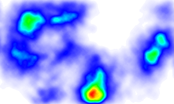 上图的每一个小叉代表一次点击(为简单起见,这儿所有的小叉都是一种颜色,事实上,可以用不同的颜色来表示不同类型的点击,比如点在超链接上的小叉画成红色,点在非超链接上的小叉画成蓝色),从图上可以大致看出来页面上哪几个区域的点击比较密集。但很多时侯,我们其实并不想精确地了解用户具体是点在哪个像素上,——很多时候,用户是点在这个像素上,还是点在右边相邻的像素上,并没有什么区别,我们想知道的,只是一个区域内的总的点击情况,或者说用户对这个页面上各个区域的兴趣情况。这个时候,热区图(或叫热力图)就可以派上用场了。