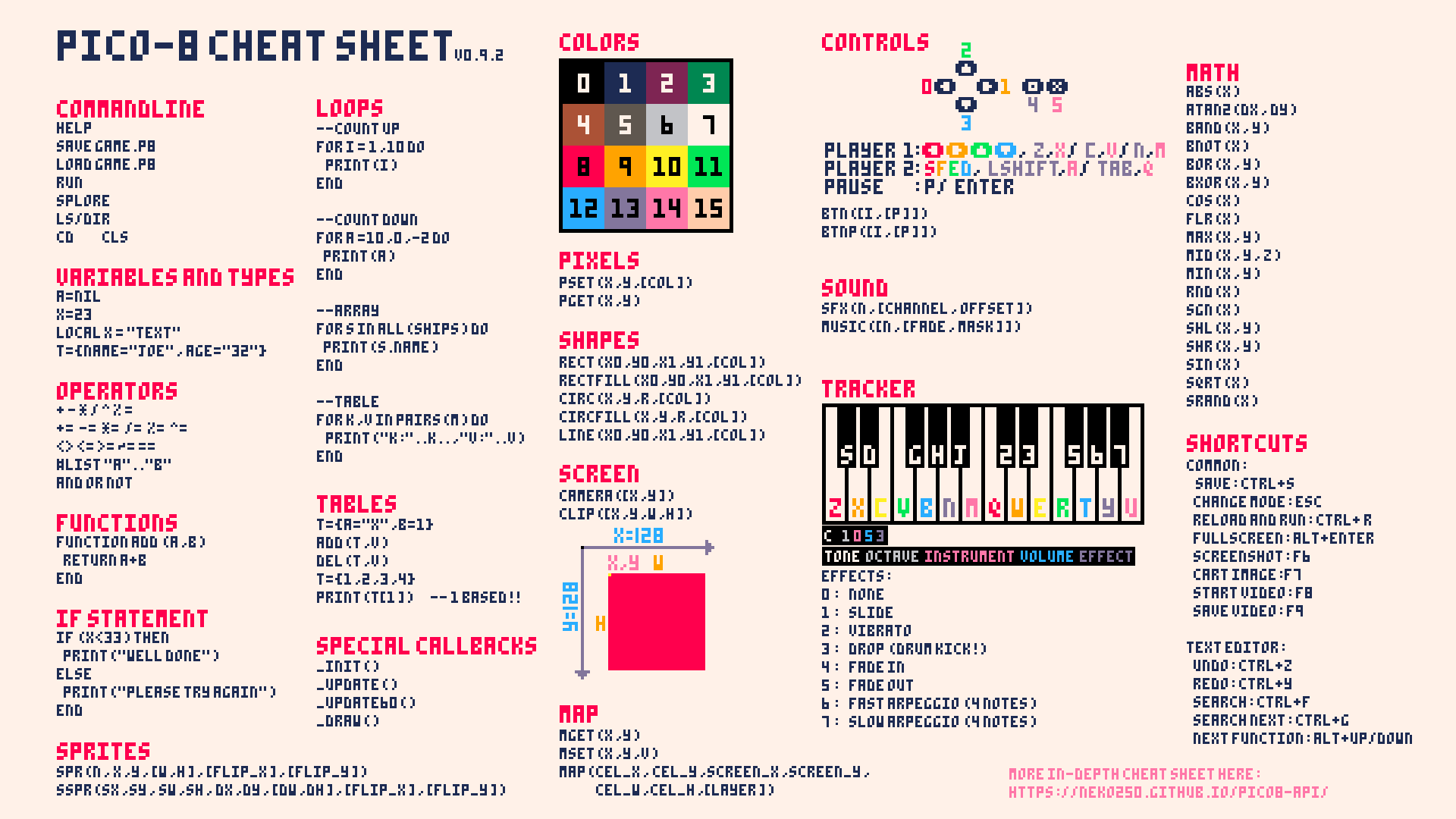 PICO-8 使用 Lua 作为编程语言,但并不是标准 Lua,而是一个精简过同时添加了一些新内置函数的 Lua。基本语法与标准 Lua 一致,可用的方法基本上看下面总结出的 Cheat sheet 就可以: