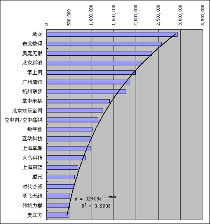 前几日看到移动百宝箱 7 月 KJAVA 全网排名前 20 名的当月收入表格,隐约觉得其中会有关系可挖掘,便将其按收入从高到低排列,画出柱状图,再添加趋势线,发现收入 y 与排名 x 之间有非常完美的指数函数关系,如下图所示: