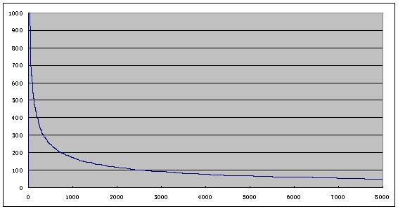 仔细看我上面下载图表 (2) 式中 \(y\) 与 \(x\) 的关系,再来看 Zipf 定理,会发现 Zipf 定理是下载图表 (2) 式关系中当 \(b = 1\) 时的特例。另外,根据当时网站上百万条下载记录统计出来的数据则显示下载图表关系中的 \(b < 1\)。