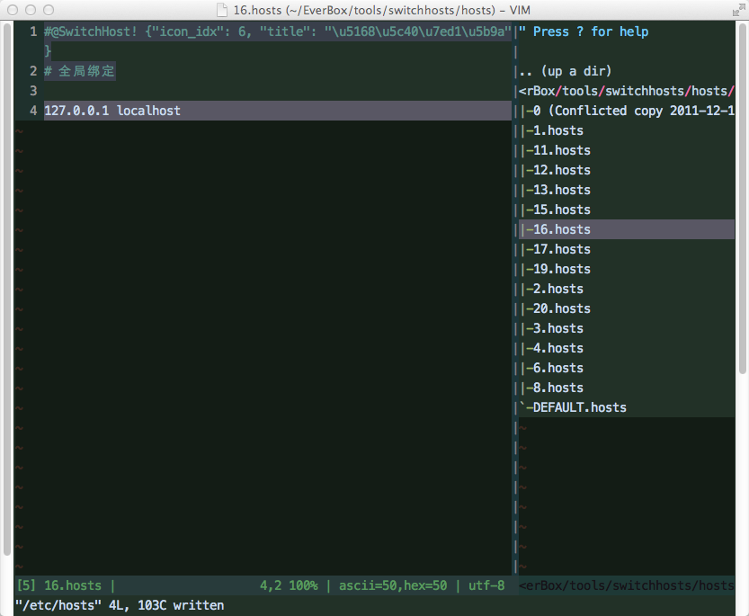 最近一段时间,我也开始将日常工作环境搬到 Mac 上来,迫切需要一个方便切换 hosts 绑定的工具,但一直没有找到合适的。终于,在再一次搞不定 Mac 版的 SwitchHosts! 之后,我想到了万能的 Vim,一下子豁然开朗,很快就弄出了这个基于 Vim 的 hosts 切换方案。