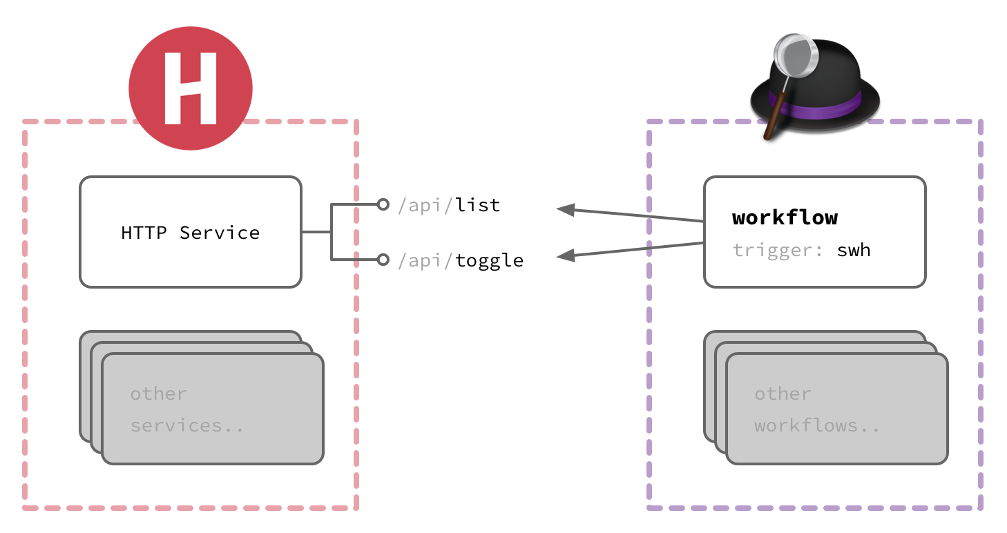 工作原理非常简单:SwitchHosts 启动时,开启一个 HTTP 服务,提供了 list 以及 toggle 两个接口,顾名思义,list 就是列出所有可用的 hosts 方案,toggle 则是切换指定方案。接下来,Alfred 则根据用户指令,请求对应的接口。如下图所示: