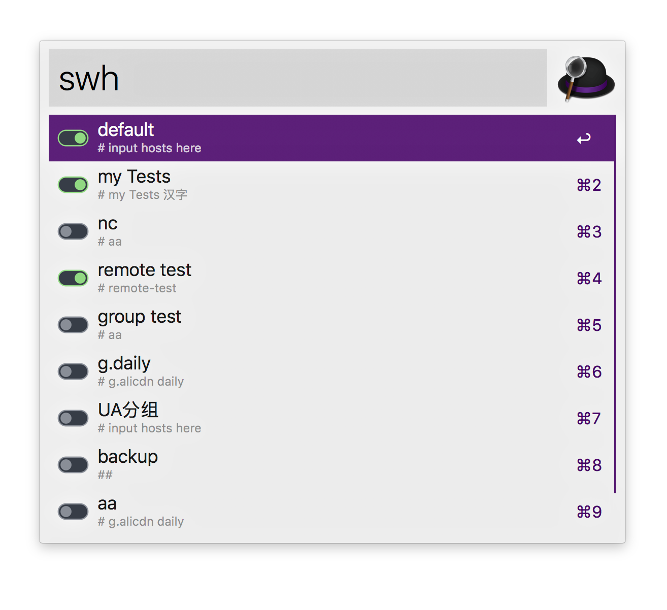 swh,即可列出当前 hosts 方案列表,并可直接在下拉菜单中进行切换